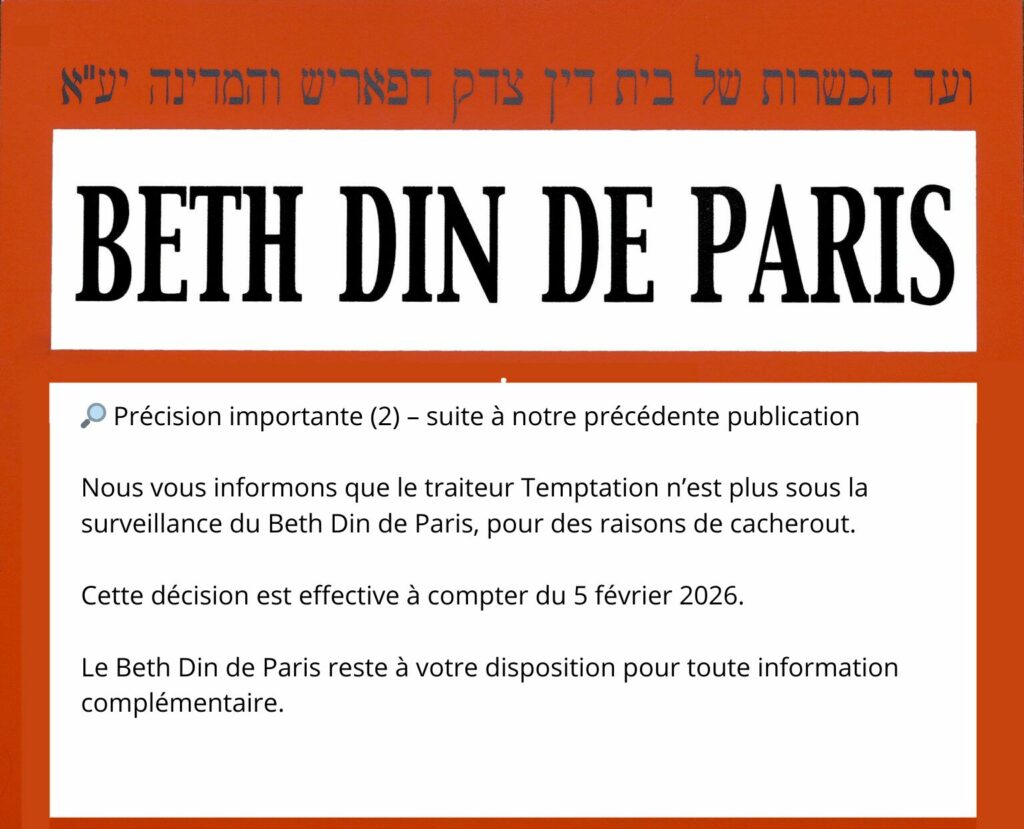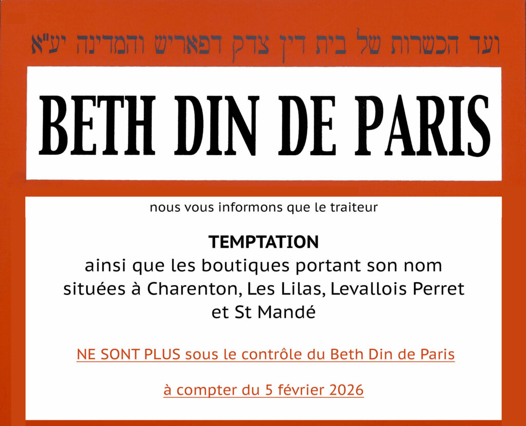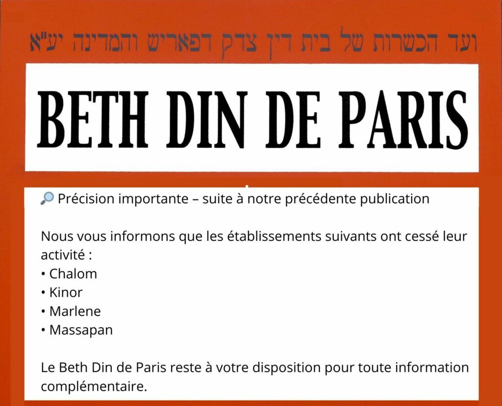 Nous vous informons que les Etablissements BERBECHE – boucheries et restaurants – ne bénéficient plus de l’agrément du Beth Din de Paris.