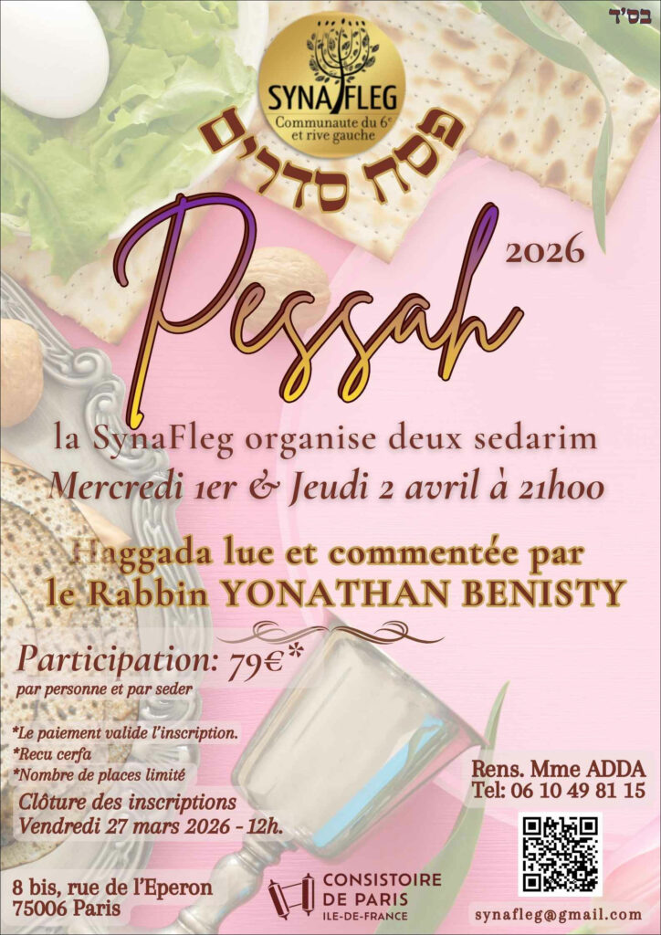 Autour d’un repas de fête, nous nous retrouverons pour vivre, partager et nous rassembler afin de célébrer ensemble la sortie d’Égypte, moment fondateur de notre histoire et de notre identité.
