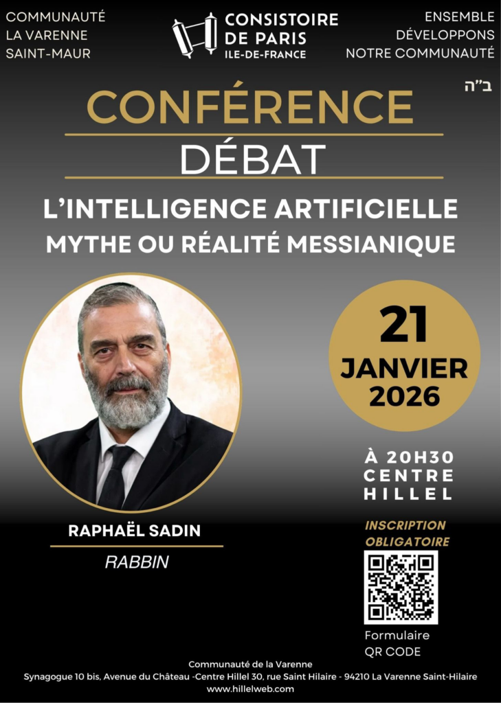 *Alors que l’IA bouleverse nos structures sociales et redéfinit les limites de l’esprit humain*, Le Rav Raphaël SADIN nous interrogera : s’agit-il d’un simple outil technique ou des prémices d’une mutation spirituelle majeure ? Entre fantasme technologique et prophétie, Le Rav Raphaël SADIN confrontera l’artifice technologique à la vérité de la Torah, afin de déterminer si l’intelligence artificielle n’est qu’un mirage de la modernité ou le vecteur d’une accélération messianique sans précédent. Une soirée pour décrypter l’invisible derrière le code.
