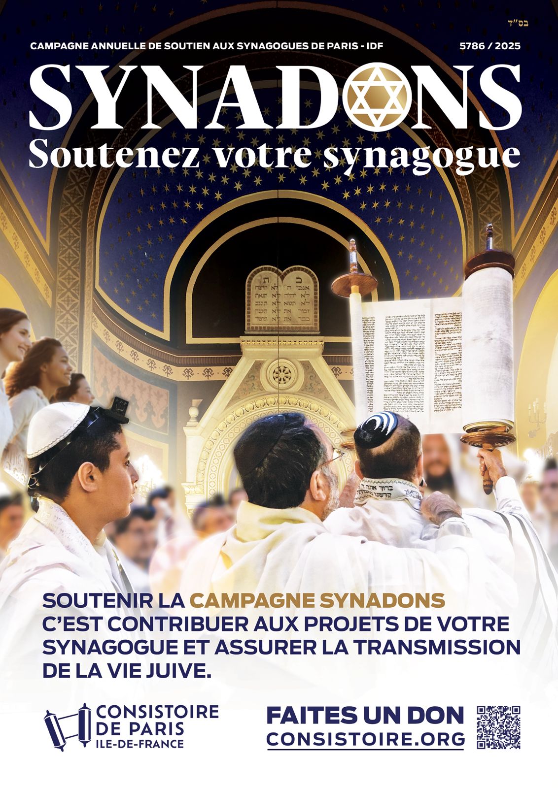 Participer à Synadons, c’est prendre part activement au développement de sa synagogue, lui donner les moyens de transmettre, d’accueillir, de protéger et de faire vivre une vie communautaire dynamique et solidaire. Votre mobilisation est essentielle. Ensemble, par notre engagement, nous contribuons au dynamisme et au rayonnement de nos communautés, aujourd’hui et pour les générations à venir. |